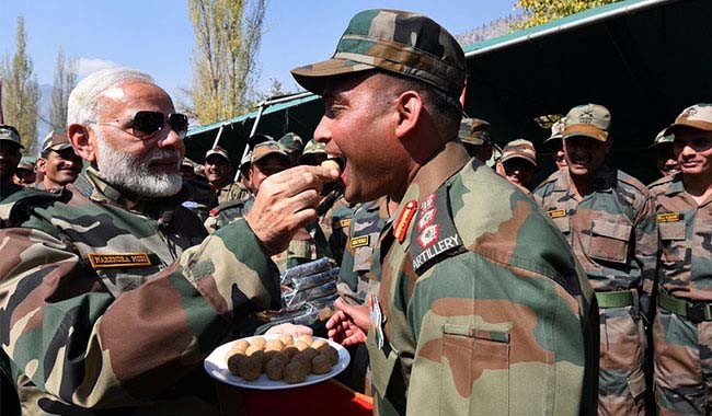 ನವದೆಹಲಿ: ಪ್ರಧಾನಿ ನರೇಂದ್ರ ಮೋದಿ ಈ ಬಾರಿಯ ದೀಪಾವಳಿಯನ್ನು ಹಿಮಾಚಲ ಪ್ರದೇಶದಲ್ಲಿ ಗಡಿ ಕಾಯುತ್ತಿರುವ ಯೋಧರ ಜತೆ ಆಚರಿಸಿದರು. ಈ ಸಂದರ್ಭದಲ್ಲಿ ಯೋಧರಿಗೆ ಸಿಹಿ ತಿನ್ನಿಸಿ ಉಭಯ ಕುಶಲೋಪರಿ ವಿಚಾರಿಸಿ, ಸೈನಿಕರಿಗೆ ಧೈರ್ಯ ತುಂಬಿದರು