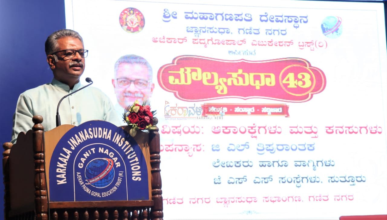 ಕಾರ್ಕಳ ಜ್ಞಾನಸುಧಾ ಶಿಕ್ಷಣ ಸಂಸ್ಥೆಯ ಆವರಣದಲ್ಲಿ ಶ್ರೀ ಮಹಾಗಣಪತಿ ದೇವಸ್ಥಾನ ಹಾಗೂ ಅಜೆಕಾರ್ ಪದ್ಮಗೋಪಾಲ್ ಎಜ್ಯುಕೇಶನ್ ಟ್ರಸ್ಟ್ನ ಸಹಯೋಗದಲ್ಲಿ ನಡೆಯುತ್ತಿರುವ ಮೌಲ್ಯಸುಧಾ ಮಾಲಿಕೆ-೪೩ರಲ್ಲಿ ‘ಆಕಾಂಕ್ಷೆಗಳು ಮತ್ತು ಕನಸುಗಳು’ ಎಂಬ ವಿಷಯದ ಕುರಿತು ವಿಶೇಷ ಉಪನ್ಯಾಸದಲ್ಲಿ ಮಾತನಾಡಿದರು.