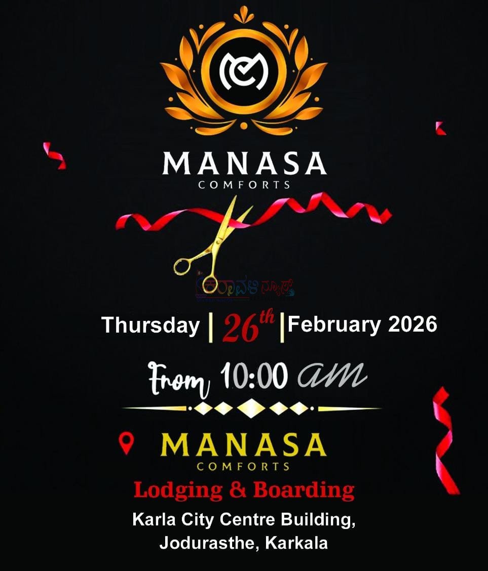 ಕಾರ್ಕಳ, ಫೆ.25: ಕಾರ್ಕಳದ ಜೋಡುರಸ್ತೆಯ ಕಾರ್ಲ ಸಿಟಿ ಸೆಂಟರ್ ಕಟ್ಟಡದಲ್ಲಿ ನೂತನವಾಗಿ ನಿರ್ಮಾಣಗೊಂಡಿರುವ “ಮಾನಸ ಕಂಫರ್ಟ್ಸ್” ಇದರ ಉದ್ಘಾಟನಾ ಸಮಾರಂಭವು ನಾಳೆ (ಫೆ. 26) ಬೆಳಿಗ್ಗೆ 10 ಗಂಟೆಗೆ ನಡೆಯಲಿದೆ.