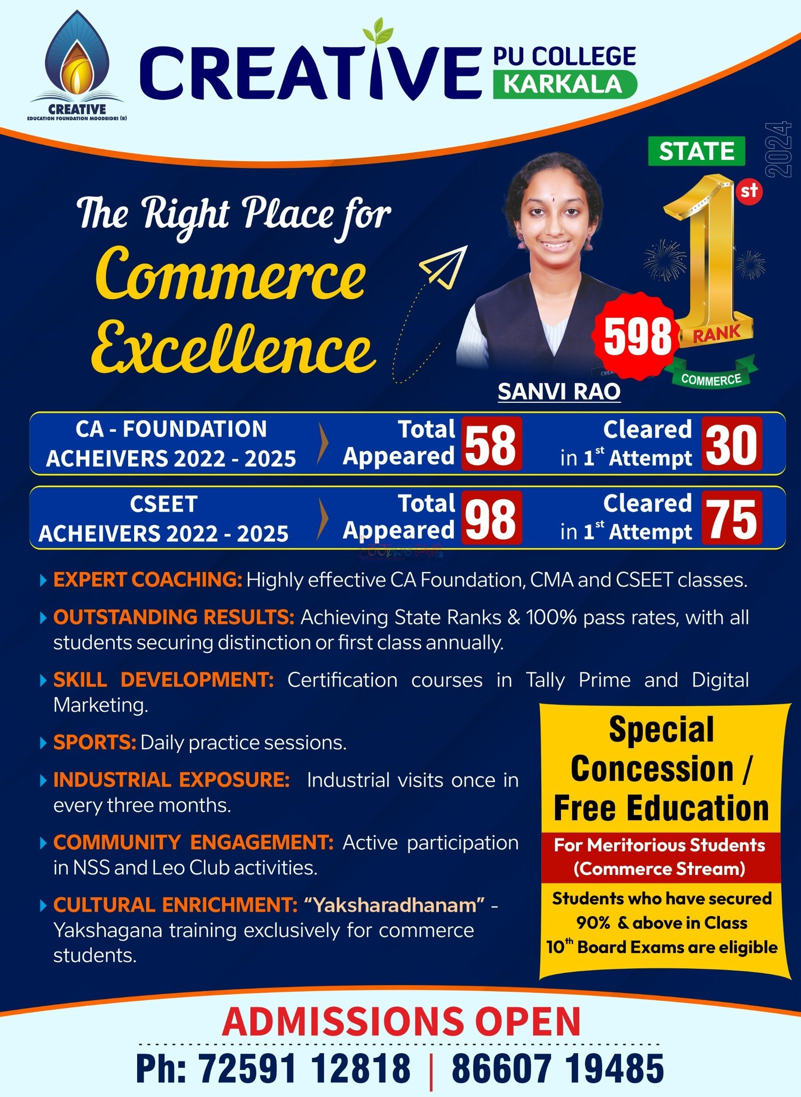 ಕಾರ್ಕಳ,ಏ.04: 2026 -27ನೇ ಶೈಕ್ಷಣಿಕ ಸಾಲಿನ ಹತ್ತನೇ ತರಗತಿ ಪರೀಕ್ಷೆಯಲ್ಲಿ 90%ಕ್ಕಿಂತ ಅಧಿಕ ಅಂಕ ಗಳಿಸಿದ ಕಾರ್ಕಳದ ಸ್ಥಳೀಯ ವಿದ್ಯಾರ್ಥಿಗಳು ವಾಣಿಜ್ಯ ವಿಭಾಗವನ್ನು ಸೇರಬಯಸುವುದಾದರೆ ಕ್ರಿಯೇಟಿವ್ ಶಿಕ್ಷಣ ಸಂಸ್ಥೆಯ ಹೊಂಗಿರಣ ಯೋಜನೆಯಡಿಯಲ್ಲಿ ವಿಶೇಷ ರಿಯಾಯಿತಿಯನ್ನು ಪಡೆದುಕೊಳ್ಳಬಹುದಾಗಿದೆ. ಅತ್ಯಧಿಕ ಅಂಕ ಗಳಿಸಿದ ವಿದ್ಯಾರ್ಥಿಗಳಿಗೆ ವಾಣಿಜ್ಯ ವಿಭಾಗದಲ್ಲಿ ಉಚಿತ ಶಿಕ್ಷಣಕ್ಕೂ ಅವಕಾಶ ಕಲ್ಪಿಸಲಾಗಿದೆ. ವಾಣಿಜ್ಯ ವಿಭಾಗದಲ್ಲಿ ಸಾನ್ವಿರಾವ್ ಎಂಬ ವಿದ್ಯಾರ್ಥಿನಿ 598 ಅಂಕಗಳನ್ನು ಗಳಿಸುವುದರ ಮೂಲಕ ರಾಜ್ಯಕ್ಕೆ ಪ್ರಥಮ ಸ್ಥಾನಿಯಾಗಿ ಗುರುತಿಸಿಕೊಂಡಿರುವುದು ಕ್ರಿಯೇಟಿವ್ ಶಿಕ್ಷಣ ಸಂಸ್ಥೆಯ ಹೆಗ್ಗಳಿಕೆಯಾಗಿದೆ.